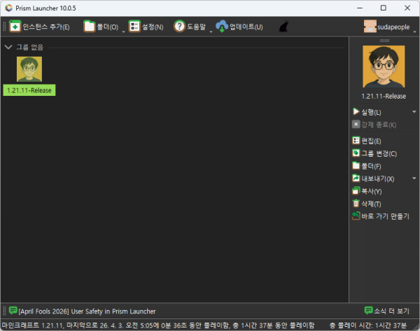 프리즘런처를 실행하면 가장 먼저 표시되는 화면입니다. 마인크래프트 인스턴스의 관리, 실행, 계정 전환 등 전반적인 작업을 수행하는 주 화면입니다.